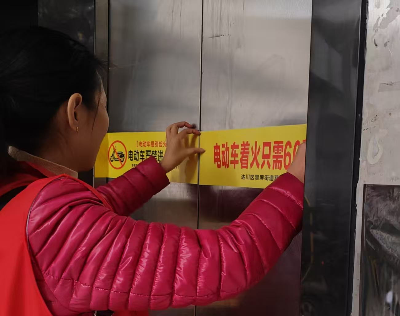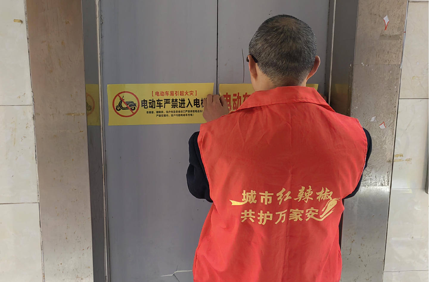 (张贴“电动车严禁进入电梯”安全警示标语)