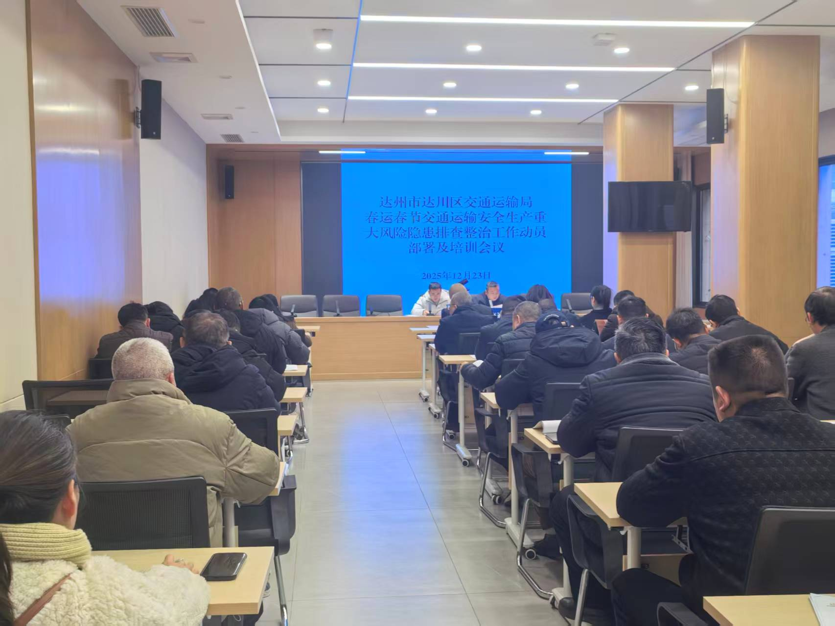 为全力保障2026年春运春节期间交通运输安全,12月23日,达川区交通运输局组织召开专项工作动员部署暨培训会议。会议深入学习相关工作方案,并对全区交通运输领域风险隐患排查整治行动进行了系统部署。局属各单位、相关业务股室、辖区运输企业及在建项目负责人参加会议。