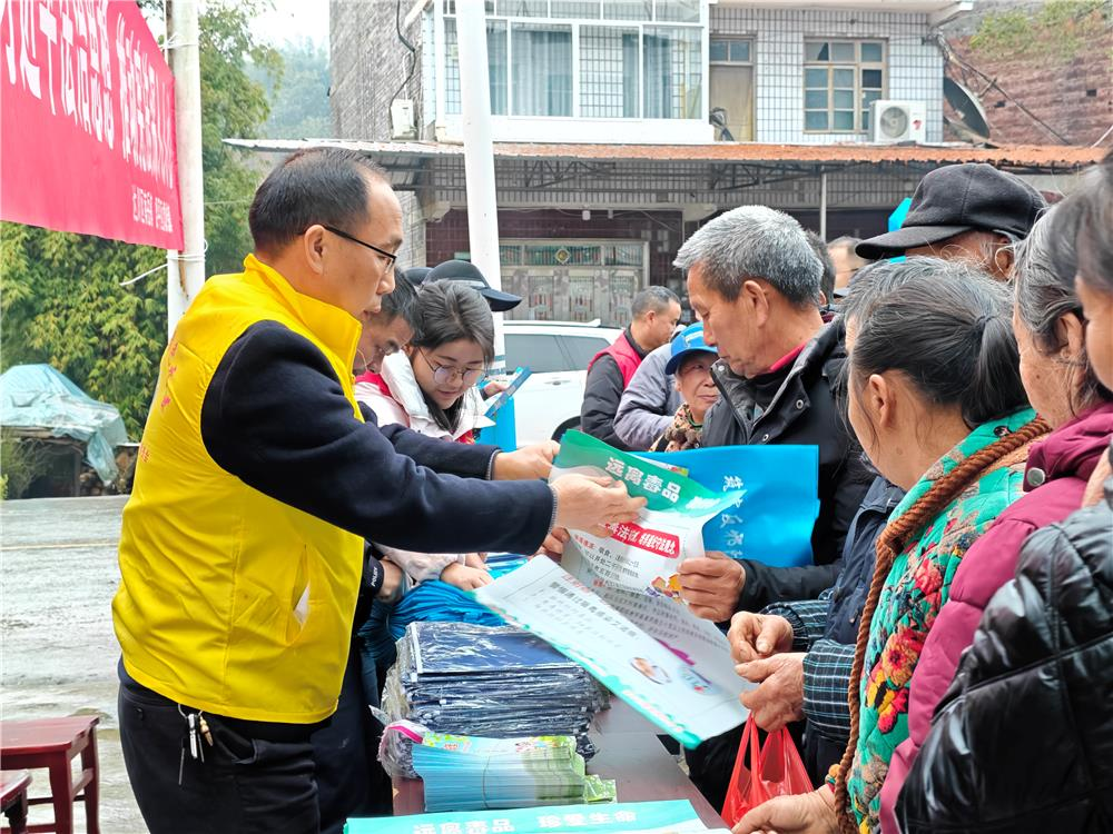 12月24日,南岳镇铁嘴村,工作人员向群众发放禁毒反诈宣传资料。(虎城镇供图)