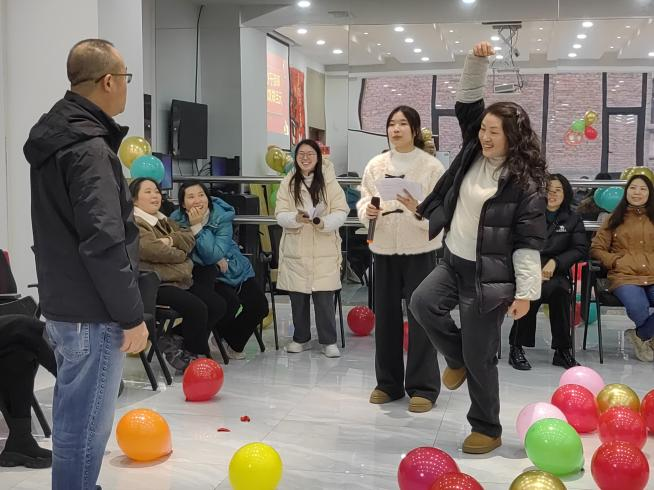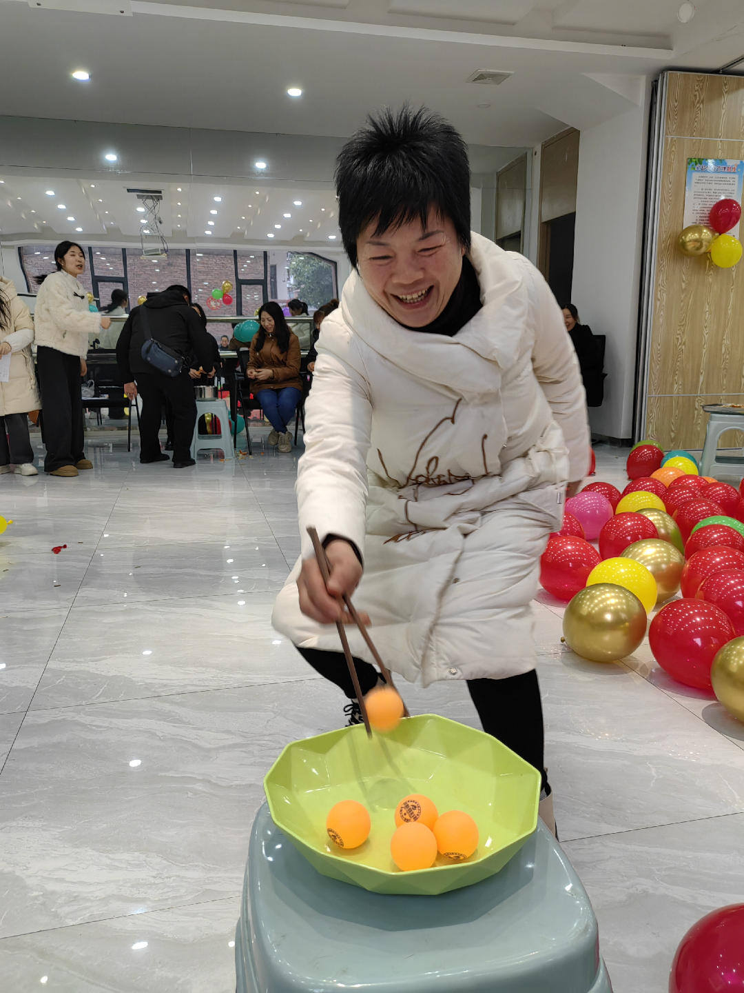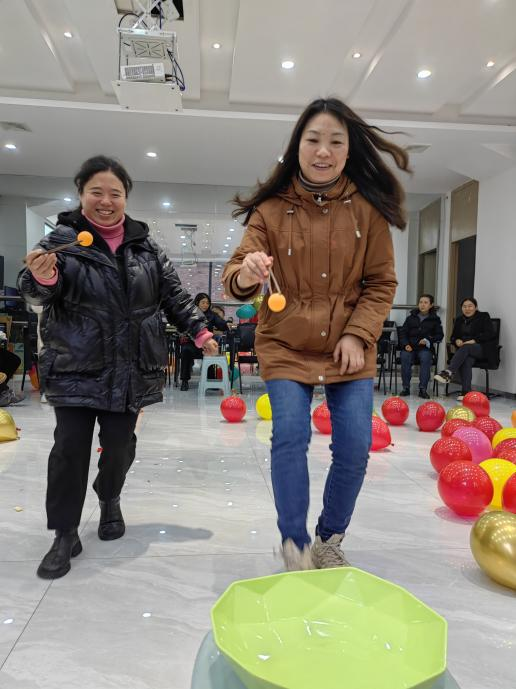 活动现场张灯结彩,红色与金色主色调相映成趣,主题横幅醒目亮眼,灯笼、彩带与窗花将会议室装点得温馨热烈。签到区、游戏区、茶点区等区域划分清晰,工作人员各司其职,为活动有序开展保驾护航。社区工会负责人王娜向大家作新年致辞,元旦联欢活动正式拉开帷幕。趣味游戏环节成为全场焦点,“你划我猜”“夹乒乓球”两项活动接连登场,会员们随机抽签组队,在协作比拼中增进了解。比画者活灵活现,猜词者脑洞大开;夹球选手屏气凝神,稳中求进,现场欢笑声、喝彩声此起彼伏。游戏结束后,工作人员为获胜小组及参与会员颁发洗衣液、毛巾、牙膏和牙刷等实用奖品,鼓励大家积极投身社区建设。茶点区里,瓜子、花生、时令水果与矿泉水整齐摆放,会员们边品尝美食边交流互动,分享生活趣事与社区发展建议,在其乐融融的氛围中拉近了彼此距离。