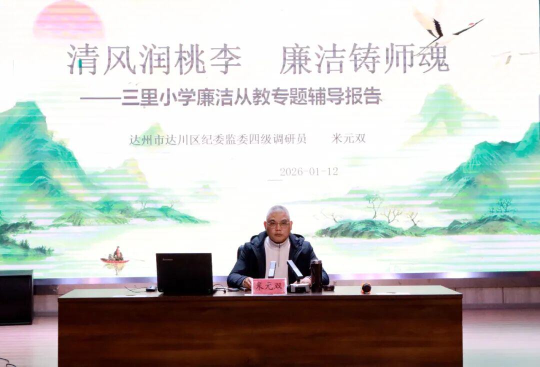 清泉濯尘明素志,正气凌云铸师魂。为强化党风廉政教育,深化师德师风建设,筑牢教职工拒腐防变的思想根基,积极营造风清气正的育人环境。近日,达川区三里小学特邀达州市达川区纪委监委四级调研员、四级高级监察官同志莅临指导,并作题为“清风润桃李 廉洁铸师魂”的廉洁从教专题教育报告。全体教职工认真聆听了这场触及灵魂的廉洁教育“思想盛宴”。