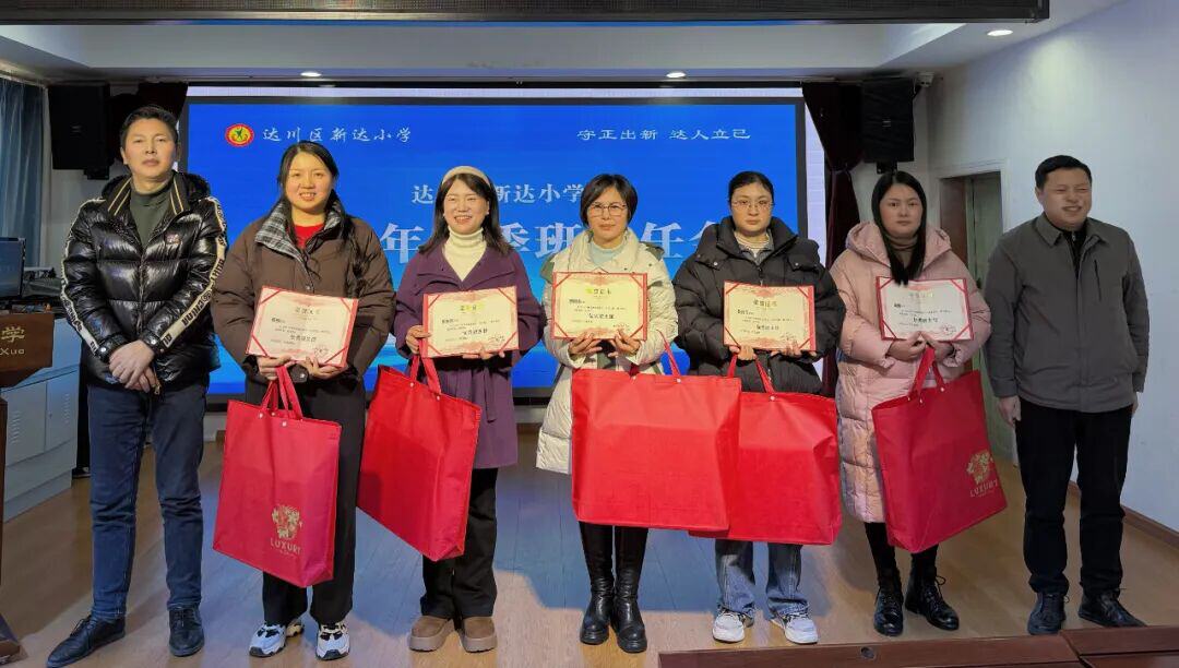 分享环节结束后,会议进入激动人心的表彰时刻。达川区新达小学书记和校长共同为在本学期班级管理工作中表现突出,荣获“优秀班主任”称号的老师们颁发荣誉证书。