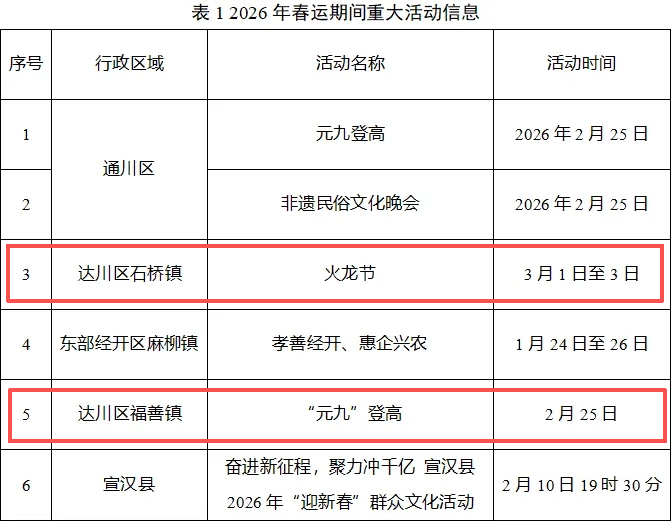 2026年春运期间,全市计划举办具有一定规模的群众性活动共6场,具体信息见表1。
