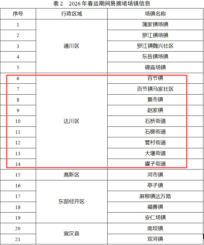 2026年春运期间,全市47个易拥堵场镇,具体信息见表2。