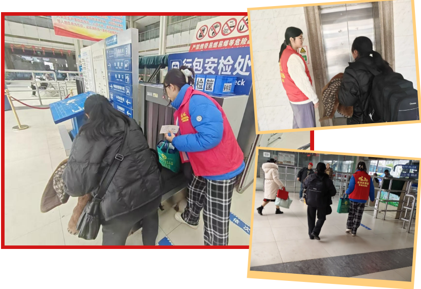 在完成岗前培训后,志愿者们分赴站内各服务点位,有序开展乘车引导、票务协助、文明劝导、行李搬运、便捷安检、临时看护等多项帮扶服务。