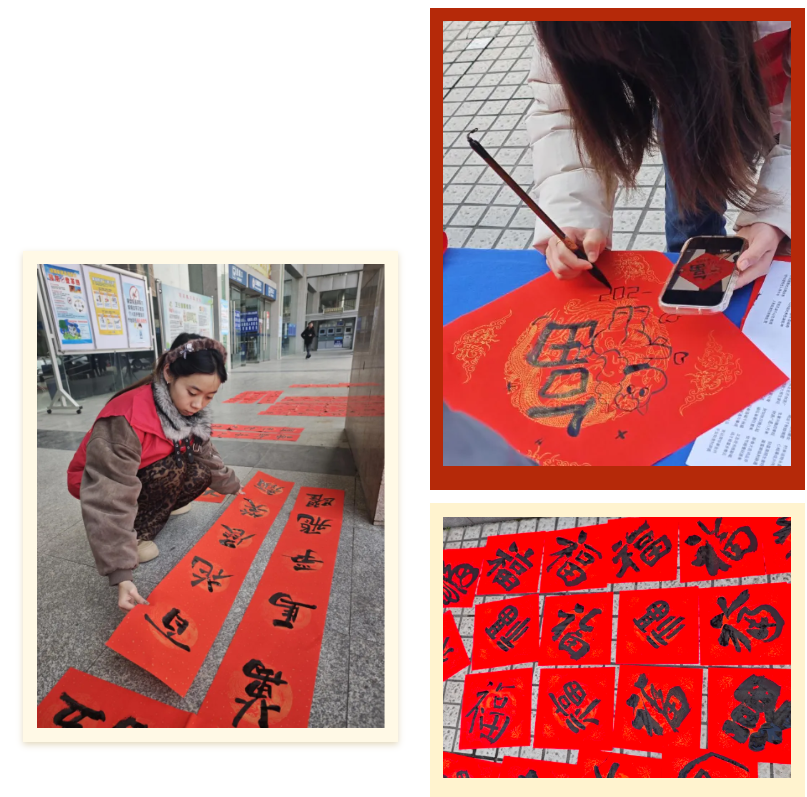 活动现场还设置“新春送福”台,志愿者挥毫书写春联赠予旅客,以笔墨传递温暖年味。