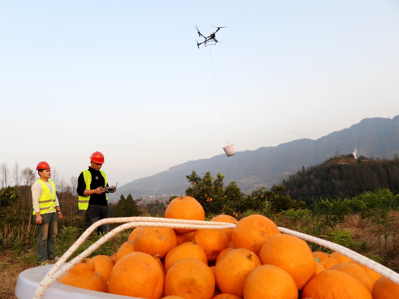 操作无人机帮助村民转运柑橘的场景