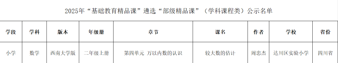 近日,教育部公布2025 年“基础教育精品课”遴选评审结果,达川区实验小学周忠杰老师的小学数学课例《较大数的估计》凭借鲜明的育人理念、创新的教学设计与扎实的教学成效,成功入选实验教学类“部级精品课”,为学校百年办学历史再添闪亮一笔。