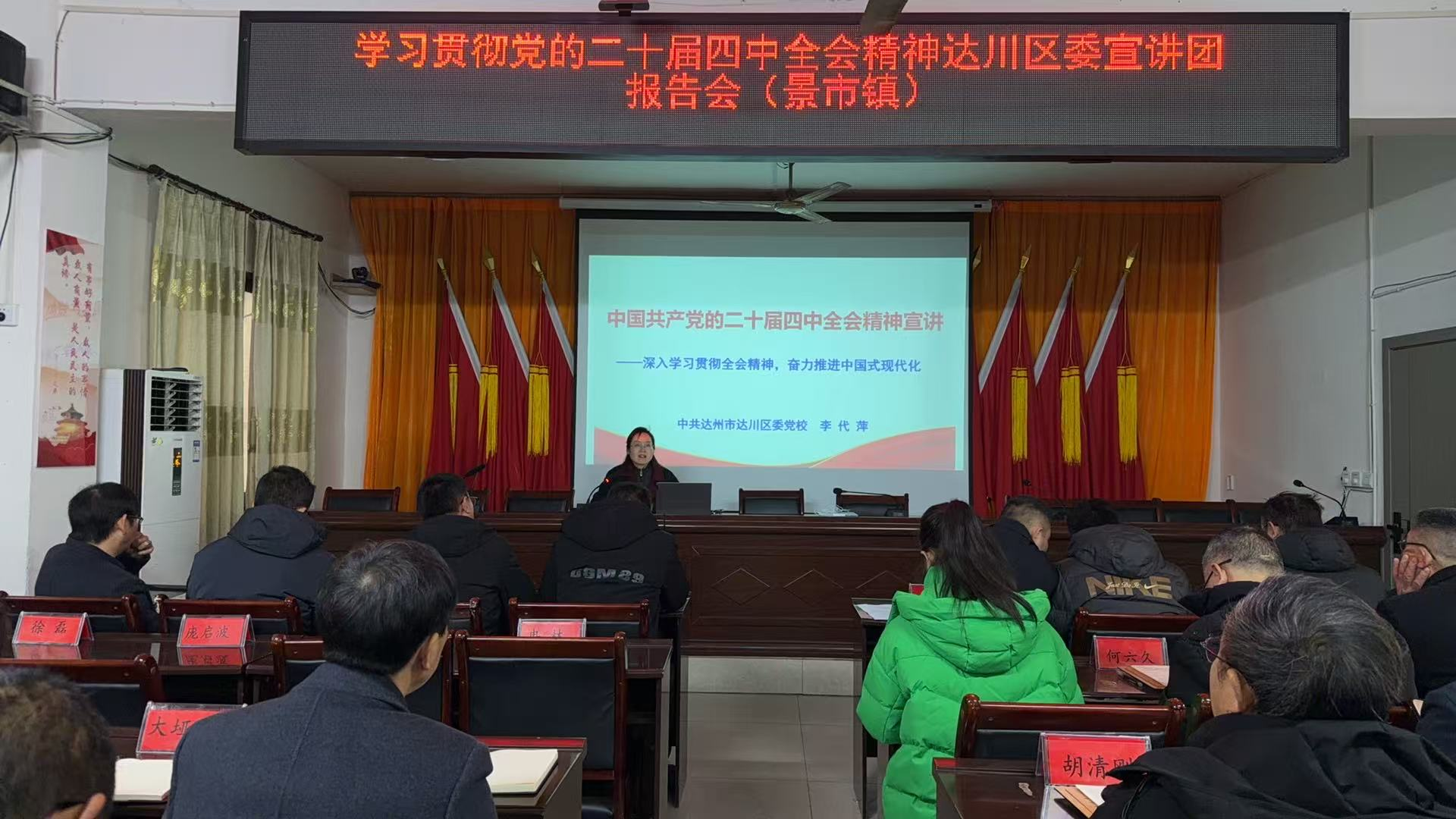 近日,景市镇召开专题学习会议,集中学习贯彻省委十二届八次全会精神,并举办学习贯彻党的二十届四中全会精神达川区委宣讲团报告会。镇党委书记主持会议,区委宣讲团成员、区委党校讲师专题辅导,全体机关干部、村(社区)党组织书记、镇属单位负责人共计90余人参会。