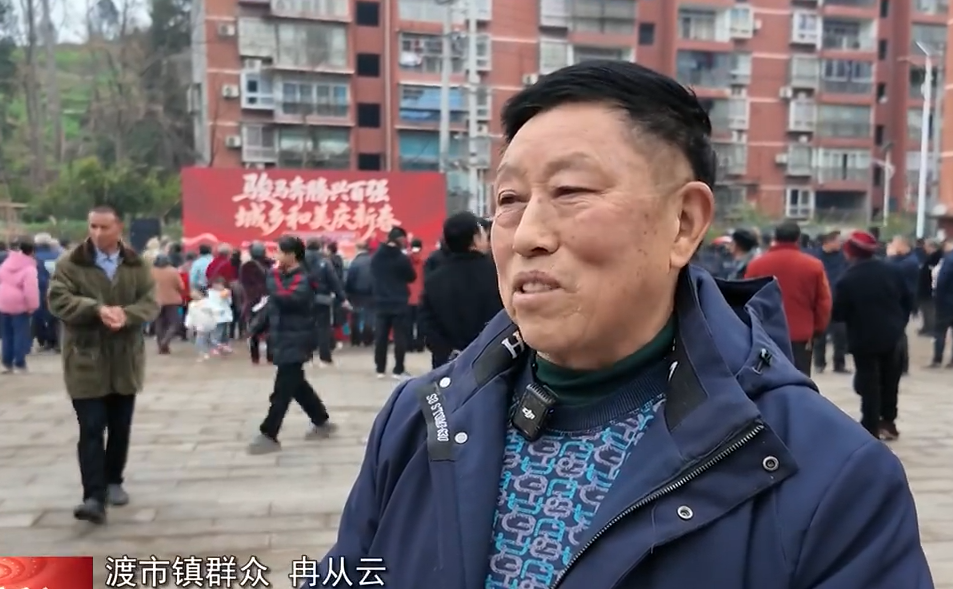 渡市镇群众 冉从云:这个活动对老百姓来说是非常满意的,特别是文艺节目,体现了地方政府关心老百姓的文娱生活,特别是现在过年了,今年马年,地方政府请的书法家给老百姓赠送春联,还有各种活动,老百姓也是非常满意的。