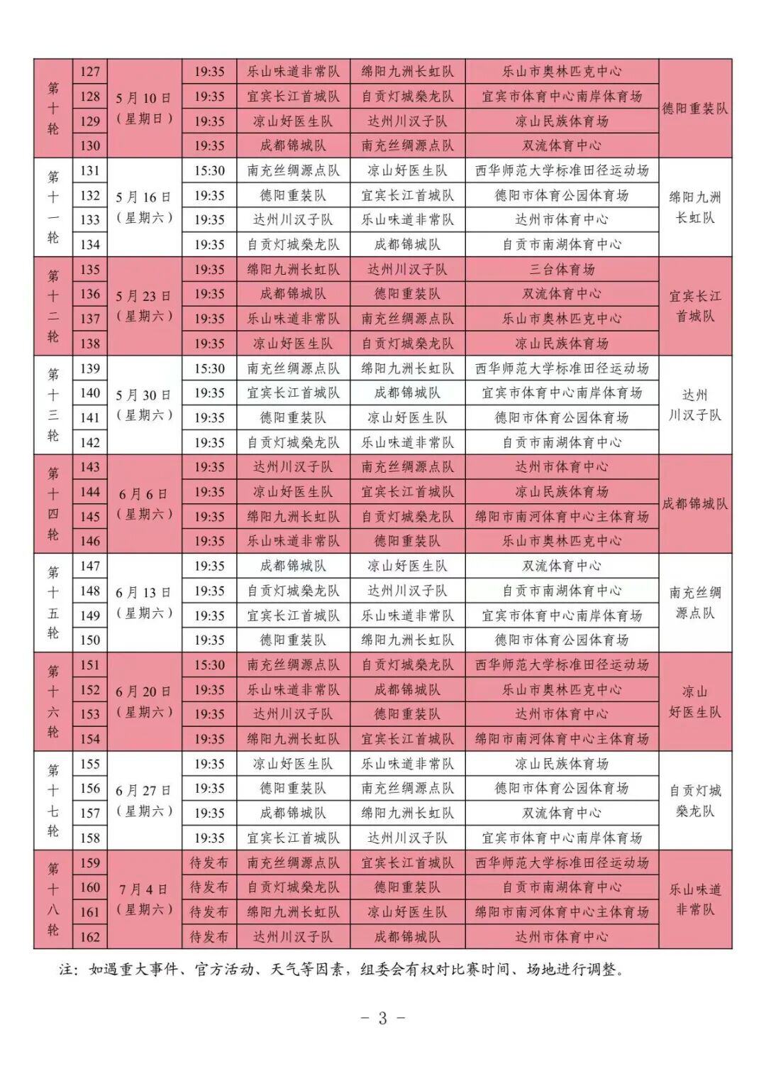 2025/2026四川银行四川省城市足球联赛决赛阶段将从2026年3月一直持续到2026年7月。决赛阶段采用主客场双循环赛制,成都锦城队、南充丝绸源点队、达州川汉子队、凉山好医生队、乐山味道非常队、自贡灯城燊龙队、宜宾长江首城队、绵阳九洲长虹队、德阳重装队9支劲旅将通过18轮共计72场比赛决出最终名次。