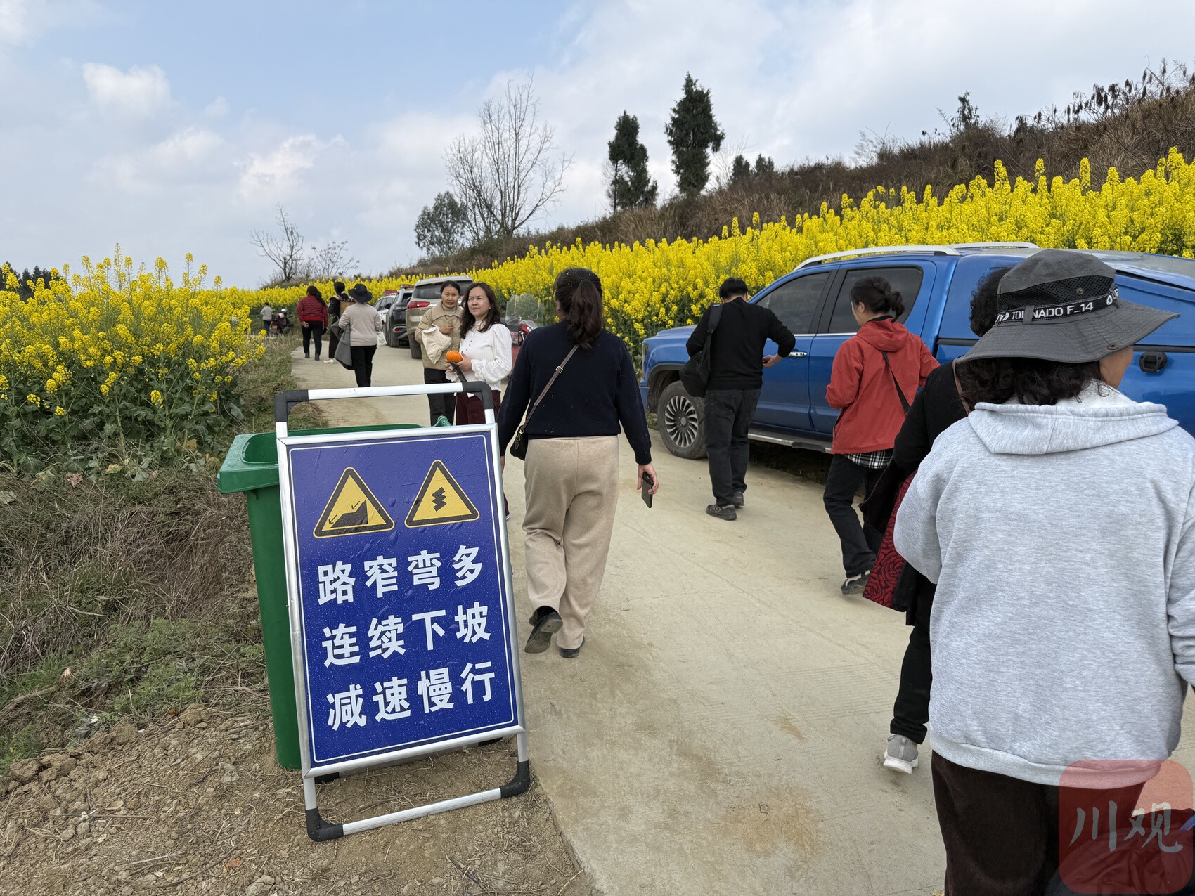 5日上午,记者前往张家山村油菜花海,刚进入龙会乡场镇,就看到身着浅黄色马甲的交通劝导员拿着喇叭向“车队”喊:“看油菜花,请直行。”