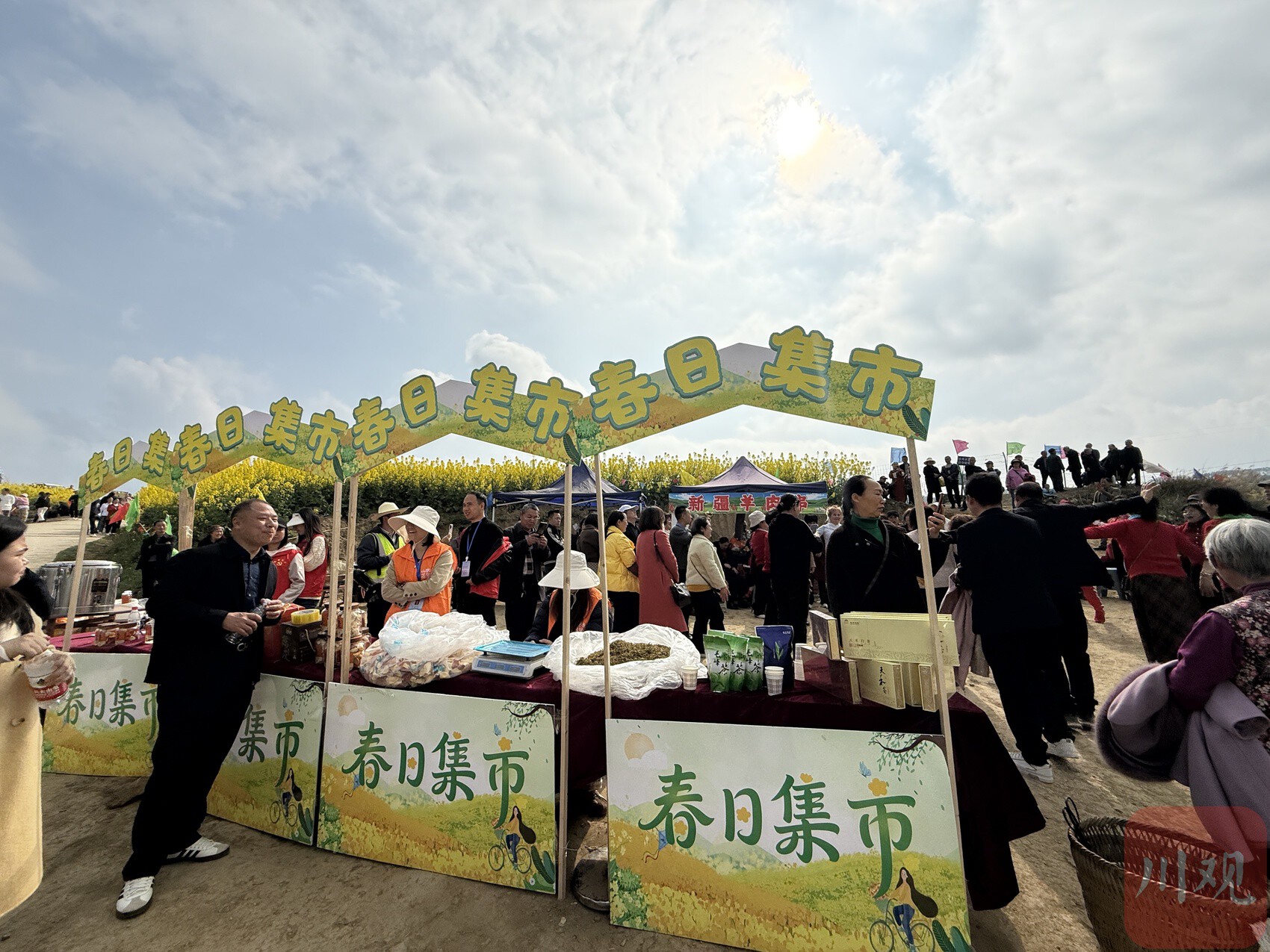 当天,山顶一片开阔泥地上的“春日集市”热闹非凡,有烧烤、米粉、𤆵𤆵柑、茶叶、蜂蜜等摊位,以及提供免费的白开水、白茶,达州市开心艺术团30多名成员在此演出。