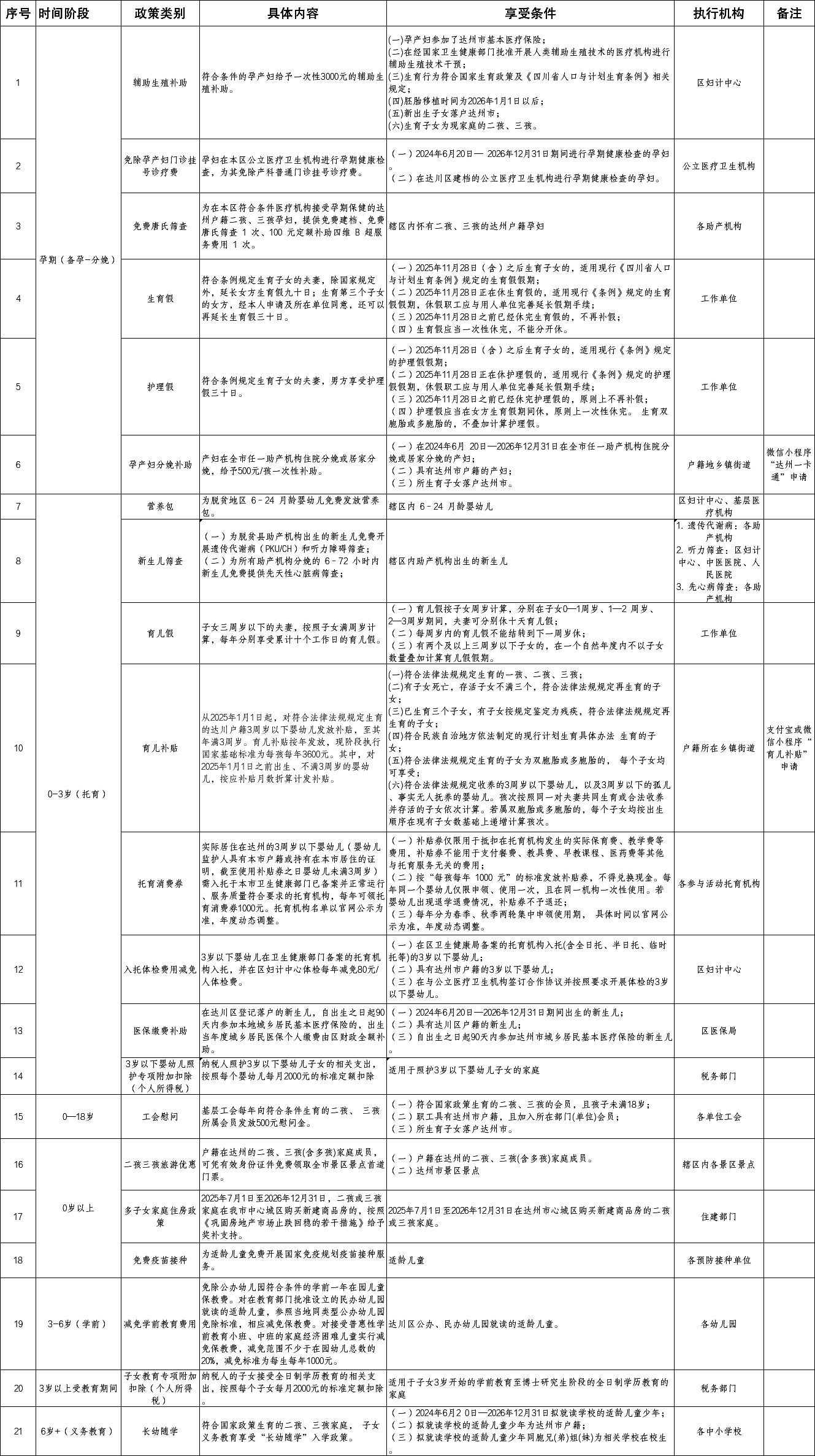 根据国家、省、市、区支持生育促进人口高质量发展若干政策措施,结合达川区实际,现将备孕到受教育期间的重点生育支持政策,以时间轴 + 表格形式呈现,覆盖医疗、假期、现金补贴、税收、托育、教育等核心支持。便于群众知晓和掌握。