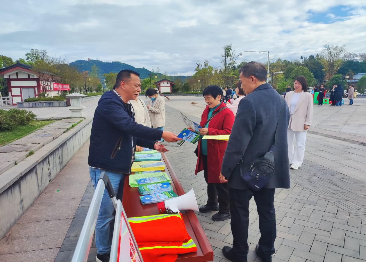 (图为翠屏街道党工委书记苟红晨,党工委副书记、街道办主任任小强,党工委委员、办事处副主任邱方全在临江公园发放宣传资料)