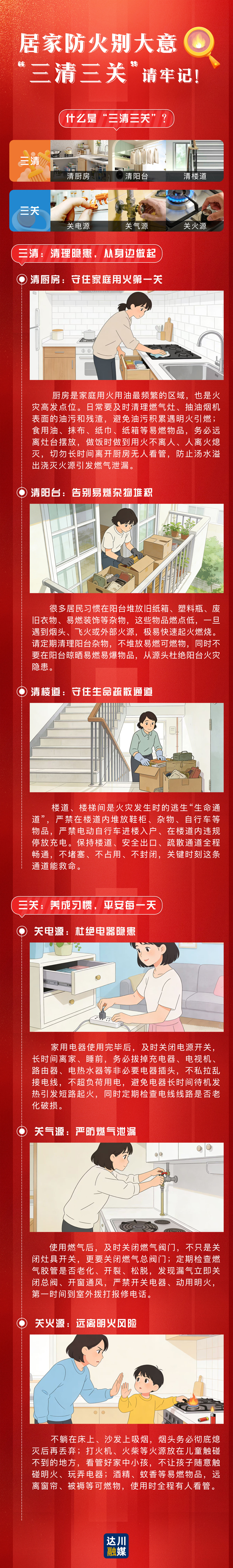 家是最温暖的港湾,消防安全是幸福生活的底线。近期各类火灾事故警示我们,居家火灾隐患往往藏在日常细节里,稍有疏忽就可能引发险情。为守护全区居民家庭安全,达川消防特意整理这份家庭“三清三关”消防安全指南,简单好记、实用性强,快转发给家人一起学起来!