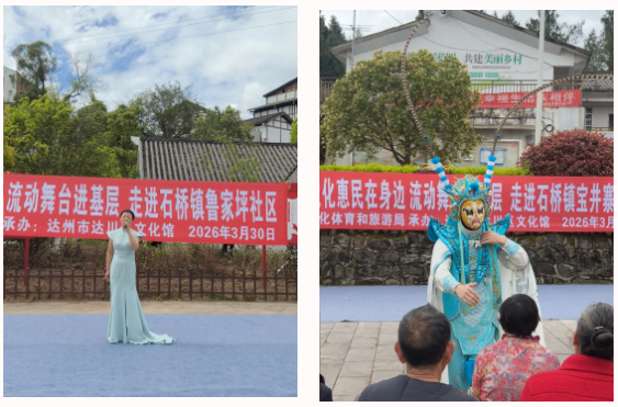 为进一步弘扬优秀传统文化,丰富基层群众精神文化生活,3月30日,由达川区文体旅局主办、达川区文化馆承办的2026年“强国复兴有我——文化惠民在身边•流动舞台进基层”演出活动在石桥镇宝井寨社区拉开帷幕,这也标志着达川区2026年度文化惠民在身边活动正式启动。