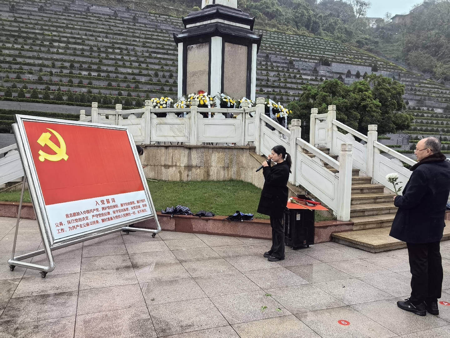 在鲜红的党旗前,全体党员高举右手,重温入党誓词。铿锵誓言在陵园上空回荡,字字句句表达了坚守初心、永担使命的坚定信念。