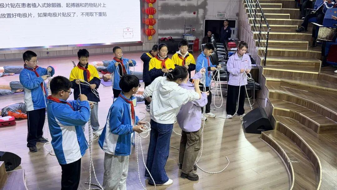 同时,尹老师还带来了逃生绳结教学,详细演示了多种实用绳结的打法,讲解其在火灾、高空逃生等场景中的应用,同学们认真学习、反复练习,快速掌握了实用的逃生技巧。
