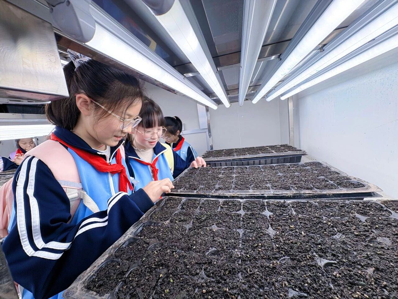 随后,孩子们走进育种室,开启更深入的探秘之旅。一排排整齐的育苗盘里,嫩绿的苎麻幼苗破土而出,纤细却挺拔,展现出生命最初的力量。从育苗基质的配置到温度湿度的调控,孩子们认真聆听、仔细记录、不时弯腰观察、小声交流——这正是学校办学理念“蒙以养正 格物致知”的真实实践,学生在亲历科学探究过程中初步形成科学观念,发展科学思维,提升探究实践能力。
