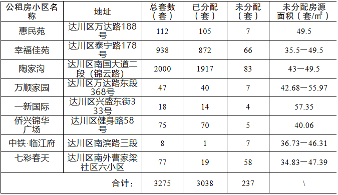 1.公租房房源信息:未分配房源237套(详见下表)。