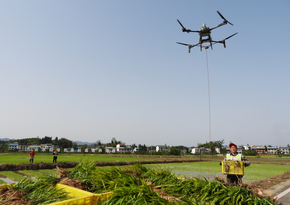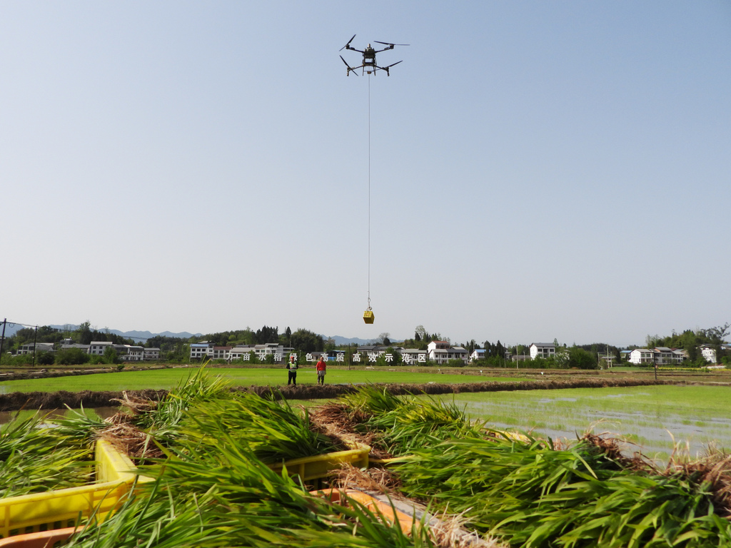 4月3日,四川省达州市,无人机将水稻秧苗从运苗车上吊起,随后将秧苗抛落到指定的田间,助力插秧作业提速增效。