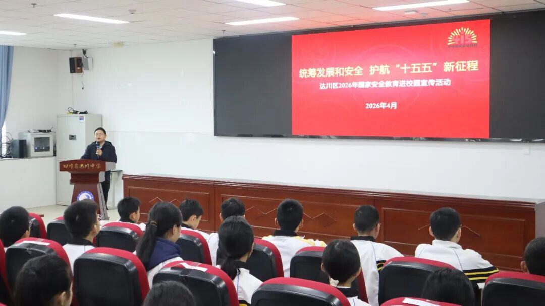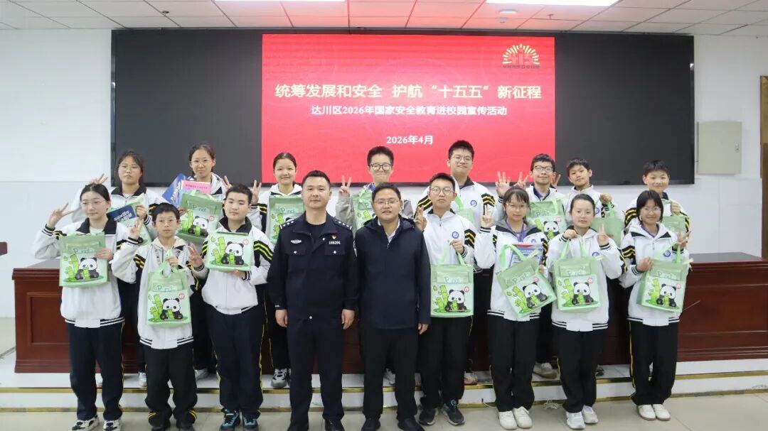 在第十一个全民国家安全教育日即将到来之际,为增强青少年国家安全意识,推动国家安全教育深入人心,4月8日上午,由达州市达川区委办公室、达川区教育局、达川区公安分局、达川区委网信办、达川区国动办、达川三里坪街道等多部门联合主办的“2026年全民国家安全教育进校园宣传活动”在达川中学三里校区多功能报告厅举行。